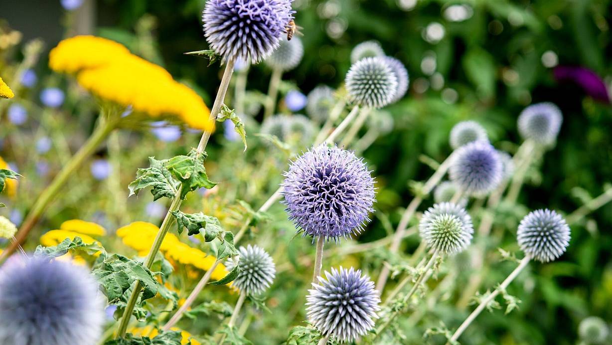 - Blühpflanzen (Stauden und Zierpflanzen): Kugeldistel, Blauroter Steinsame, Katzenminze halten intensive Sonne aus. Kartäusernelke und Mauerpfeffer brauchen nur wenig Wasser und trotzen Wind.