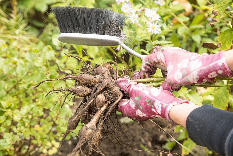 Also heißt es: raus mit den Knollen und frostfrei einlagern. Man wartet bis zum ersten Nachtfrost, dann sterben die oberirdischen Triebe ab. Ideal ist, wenn man sie dann noch etwa eine gute Woche in der Erde lässt. Wer sich Blütenfarbe und Pflanzenhöhe für die Pflanzung merken will, sollte frühzeitig während der Blüte an die Stielbasis eine Notiz mit einem Draht befestigen. Bei trockenem Wetter werden die Knollen ausgegraben und die Erde abgeschüttelt. Dann geht es ins Winterquartier.