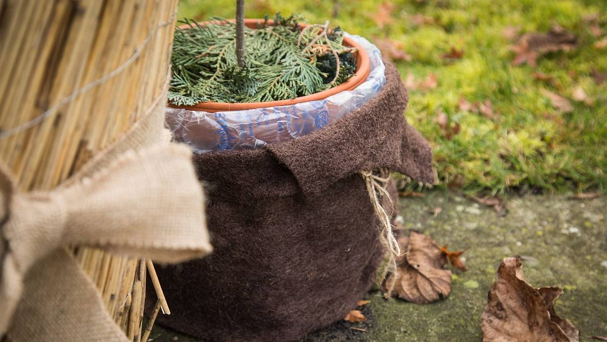 Dick eingepackt für die kalten Nächte: Mit isolierendem Material können Topfpflanzen auch im Herbst noch draußen stehen bleiben. | © Christin Klose/dpa Themendienst/dpa-tmn