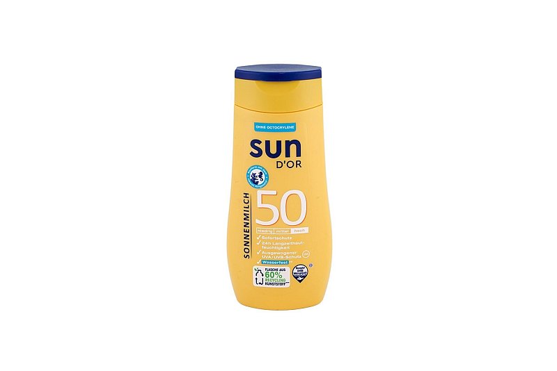 - «Sun D'Or Sonnenmilch, 50» von Budni bzw. Edeka (3,57 Euro pro 200 Milliliter)