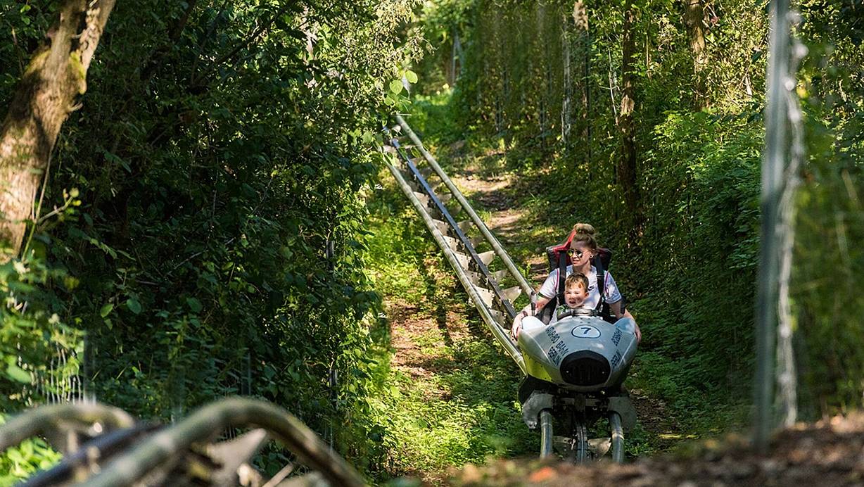 Über die Sommerrodelbahnen verlaufen zudem eine Achterbahn und ein Skywalk. Dieser führt in luftiger Höhe zwischen Baumkronen hindurch und endet an einem Felsvorsprung mit Blick ins Tal. Erlebnisfelsen ist der treffende Name für dieses Ausflugsziel.