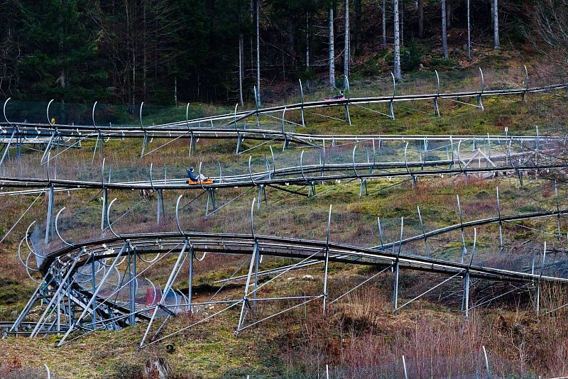 Keine andere Bahn startet wilder: Nach einer harmlosen erscheinenden Linkskurve geht es in der Wannenbahn in Garmisch-Partenkirchen erst mal nur noch rechtsherum - in einem aus drei Etagen bestehenden Kreisel. Nach der zweiten 360-Grad-Kurve geht es noch weitere 650 Meter in Richtung Tal. Genug Zeit, um auch ein wenig das Bergpanorama zu genießen. Die Bahn liegt unmittelbar neben der Olympia-Skisprungschanze.