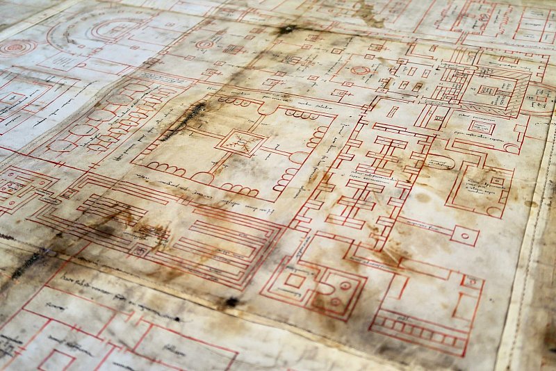 In Doras Stiftsarchiv, das wie der ganze Stiftsbezirk St. Gallen ebenfalls zum Weltkulturerbe zählt, steigt die Spannung, als der automatische Sichtschutz leise surrend hochfährt und die Zeichnung freigibt. Im Dämmerlicht lassen Linien in roter Tinte eine Klosterwelt mit Gebäuden und Gärten erkennen. Allerdings nur für wenige Sekunden, mehr Licht auf einmal verträgt das wertvolle Dokument aus Pergament, das der Benediktiner Strabo einst mitverantwortete, nicht. Umgesetzt wurde dieser die Zeiten überdauernde Plan aber nie.