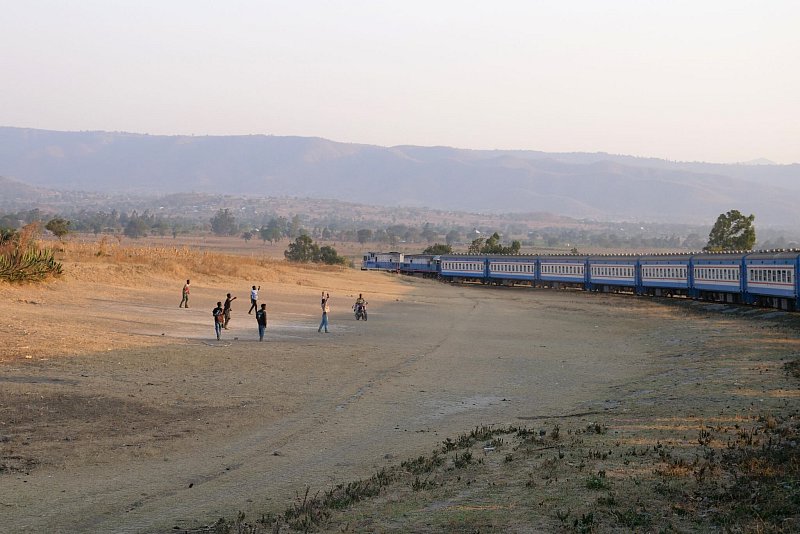 Als wir am Bahnhof der Stadt den nächsten Zug Richtung Sambia besteigen, hat dieser gerade mal zweieinhalb Stunden Verspätung. In Richtung der Grenze wird die Landschaft wieder flacher, im Sonnenuntergang laufen die Menschen am Rande der Gleise zu ihren Dörfern. Kinder winken dem Zug.