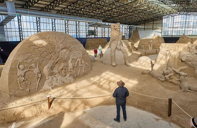 Wer auch im Winter an der Küste Sandkunst sehen möchte, ist in Prora auf Rügen richtig. Die Ausstellung im Glaspalast ist ganzjährig geöffnet, teilweise passen die Figuren mit ihrer Höhe von bis zu neun Metern nur gerade so unter das Hallendach. Die aktuelle Schau steht unter dem Motto «Mythen, Sagen und Legenden» und liefert entsprechend – mit sandigen Elfen und Zwergen, Werwölfen und Zombies, der Eiskönigin und: dem Sandmännchen.