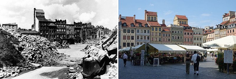 Westlich der Weichsel, wo sich der historische Kern, Königsschloss und Ghetto befanden, stand zum Kriegsende kein Stein mehr auf dem anderen. Jedoch schon 1945 richteten die Warschauer ein Büro für den Wiederaufbau der Hauptstadt ein. Sie wollten möglichst alles originalgetreu wieder aufbauen. Seit 1980 trägt Warschaus Altstadt das Siegel Unesco-Weltkulturerbe. Sie gilt weltweit als das bekannteste Beispiel einer rekonstruierten Stadt.