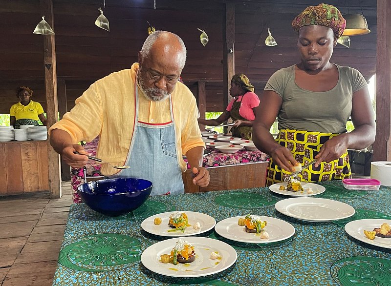 Auch Tiziano Pisoni setzt in seiner «Mucumbli Eco Lodge» unweit der Roça Diogo Vaz voll und ganz auf nachhaltigen Naturtourismus. Sie liegt auf einer Landzunge, von der man von Juli bis Oktober Buckelwale vorbeiziehen sehen kann. Die Lodge ist vor allem aber Eingangstor zum Obô-Naturpark.