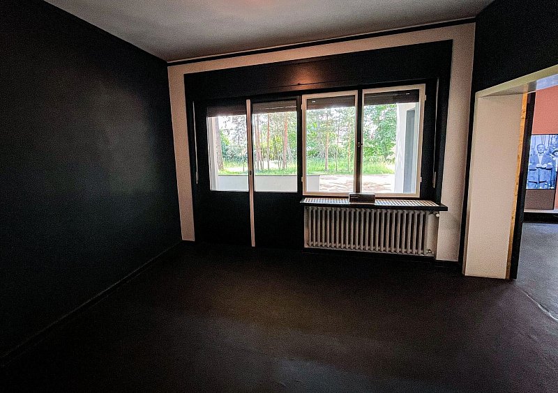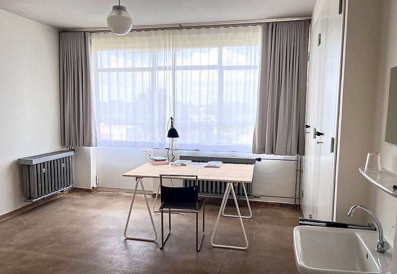 Zu dem Gebäudekomplex gehört auch das Atelierhaus. Hier wohnten Studierende und Lehrende. Heute können in den teils reinszenierten Zimmern Gäste übernachten. Minimalistisch, hell und schlicht präsentieren sich die Räume mit Bett, Schreibtisch, Kleiderschrank, Waschbecken und Balkon.