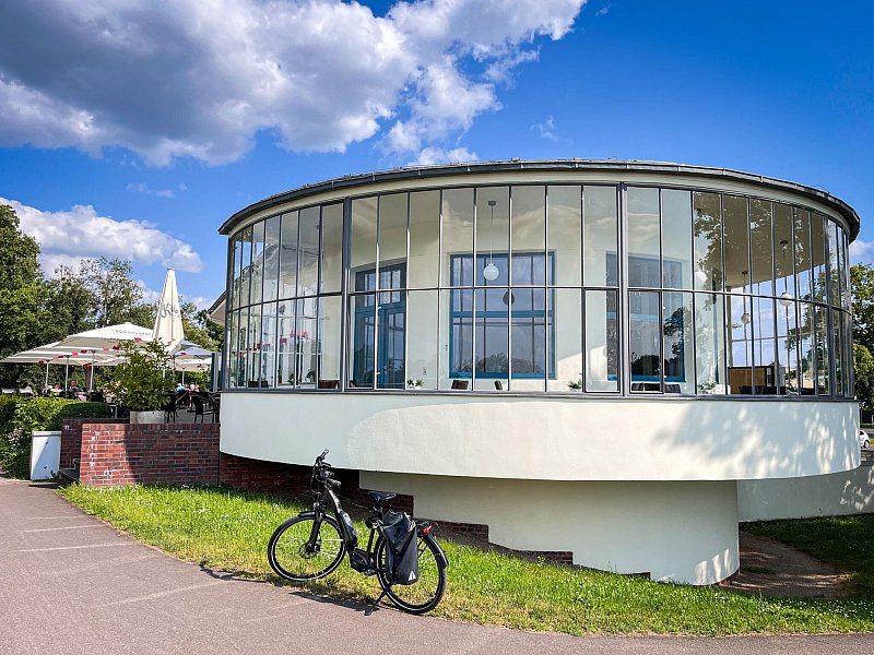 Vom Bauhausgebäude führt die Radroute durch den Park Georgium zum Kornhaus. Das von einem Bauhäusler entworfene Veranstaltungsgebäude mit Restaurant besitzt einen halbrunden Gastraum mit verglaster Wand, die zur Elbe zeigt. Tipp von Gästeführerin Martina Koppe: da sein, wenn die Sonne untergeht. Denn diese treffe im Wasser der Elbe auf den Horizont.