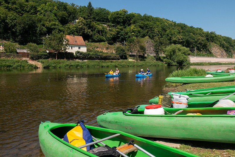 Auftakt in Zbecno, unser Einstiegspunkt liegt eine Autostunde westlich von Prag. Am Morgen liegen die Kanus startbereit auf der Wiese des Campingplatzes. Paddel, Schwimmwesten, wasserdichte Tonnen. Alles ist da. Der Verleiher hat verlässlich geliefert, aber damit erschöpft sich der Service.