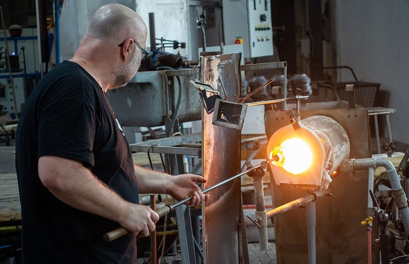 Im Etappenziel Nizbor öffnet die Glashütte ihre Besucherpforten. Zdenek Kolar ist einer von neun Glasbläsern, denen man in der Halle zuschauen darf. Es zischt und dampft. Die Fenster stehen offen. Der 52-Jährige trägt kurze Hose, Schlappen, ein schweißverkrustetes Shirt. In den Öfen erreicht die Temperatur bis zu 1.450 Grad. Ein heißer Job.