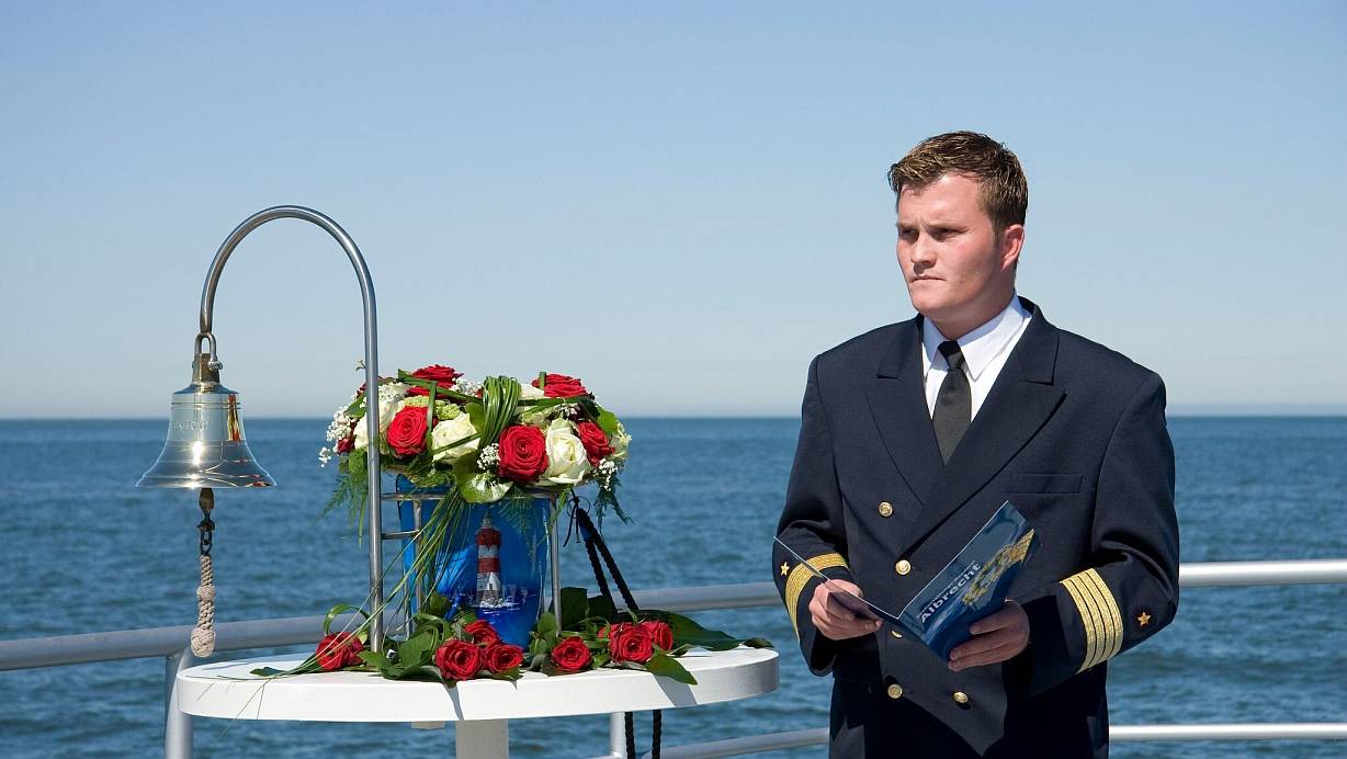 Dann verliest Benjamin Albrecht ein Gedicht, verliert ein paar persönliche Worte und schlägt mit der Schiffsglocke acht Glasen, das sind vier Doppelschläge - ein seemännischer Abschiedsgruß. «Das kommt traditionell aus der Segelschifffahrt und bedeutet: Es findet ein Wachwechsel statt.» Steuerbord, also auf der rechten Schiffsseite, lässt der Kapitän die Urne an einem Tau zu Wasser. Wenige Minuten später treiben nur noch drei rote Rosen auf den Wellen und zeigen an, wo die Urne im Wasser versank.