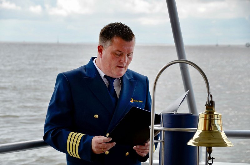 Albrecht vertieft sich kurz nochmal in die vorbereitete Rede, zieht seine Kapitänsjacke über und geht aufs Achterdeck. Dort reicht er jedem Trauergast eine Rose - so war es abgesprochen - und stellt die Urne neben die Schiffsglocke.