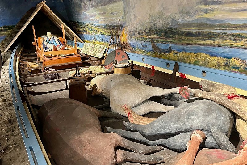 Im einzigen begehbaren Schiffsgrab Skandinaviens ist es erlaubt, einzutreten und den 22 Meter langen Rumpf zu umrunden. Darin befinden sich die Skelette von elf Pferden und vier Hunden. Am Bug verzieren eiserne Löckchen den einst bunt bemalten Drachenkopf.