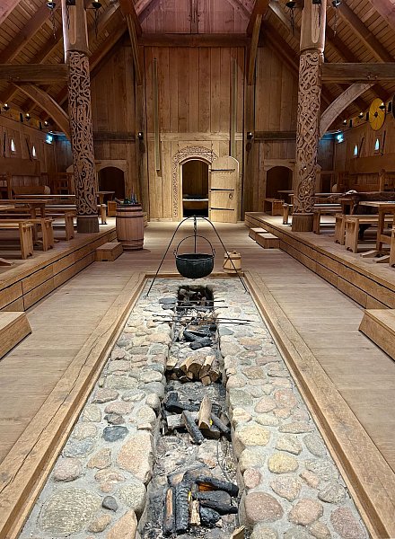 In der 60 Meter langen und 10 Meter hohen nachempfundenen Königshalle aus massiver Eiche lodert ein Kunstfeuer. Filigrane Schnitzereien von Odins Wölfen oder sich windenden Schlangen zieren dicke Säulen. Man kann sich gut vorstellen, wie jeden Moment König und Königin eintreten, auf dem Thron Platz nehmen, um sich mit Kriegern zu beraten oder ausgelassen zu feiern.