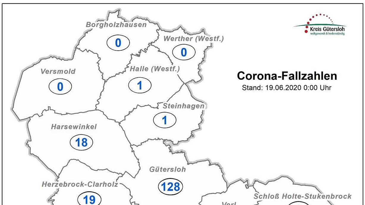 Kreis Gütersloh. Im Kreis Gütersloh wurden zum Stand 19. Juni, 0 Uhr, 1.093 (18. Juni: 959) laborbestätigte Coronainfektionen erfasst. Davon gelten 675 (18. Juni: 674) Personen als genesen und 398 (18. Juni: 265) als noch infiziert. Von diesen 398 Personen befinden sich 383 in häuslicher Quarantäne.
