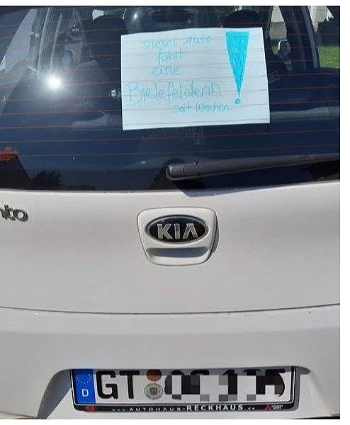 Bisher habe sie damit keine Probleme gehabt. Trotzdem hat sie jetzt einen Zettel an ihrer Heckscheibe befestigt. Darauf zu lesen: „Dieses Auto fährt eine Bielefelderin seit Wochen!" Damit hofft sie, Vandalismus vorbeugen zu können.