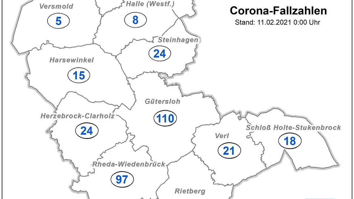 Kreis Gütersloh. Im Kreis Gütersloh waren zum Stand 11. Februar, 0 Uhr, 12.955 (10. Februar: 12.914) laborbestätigte Coronainfektionen erfasst. Dies sind kumulierte Zahlen seit Anbeginn der Pandemie. Davon gelten 12.351 (10. Februar: 12.333) Personen als genesen und 361 (10. Februar: 339) als noch infiziert. Die COVID-19-Fälle der vergangenen 7 Tage/100.000 Einwohner betragen für den Kreis Gütersloh am 11. Februar laut RKI 40,3 (10. Februar: 47,1). Anzumerken ist, dass die Zahl der neu gemeldeten Fälle deutlich höher ist als am Vortag (41 statt 13).