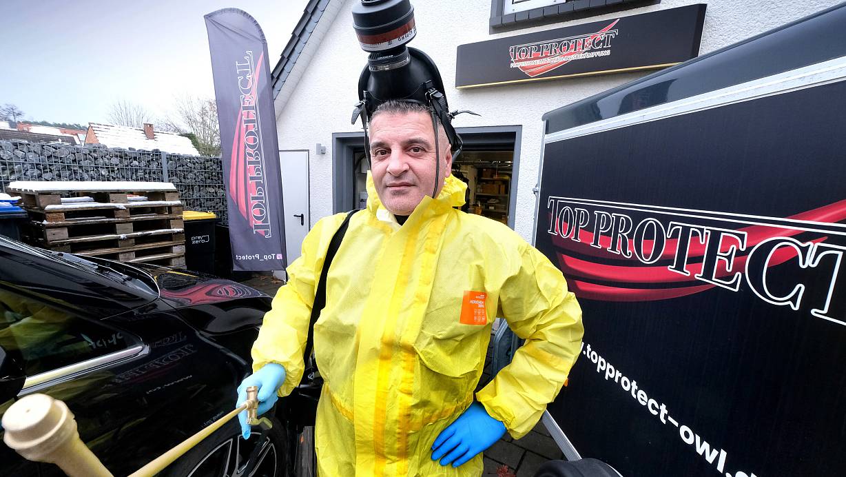 Der Gütersloher Schädlingsbekämpfer Bülent Topbac zeigt, wie er sich bei seiner Arbeit vor den Schädlingen schützt. | © Andreas Frücht