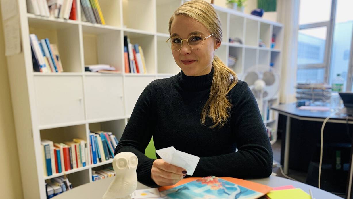 Psychologin Nicole Fritzler kombiniert relevante Lerninhalte mit spielerischen Methoden, wie Karten mit Lernwörtern. Die Eule gehört zum Innovationspreis, mit dem ihr Förderkonzpt jetzt ausgezeichnet wurde. | © Ivonne Michel