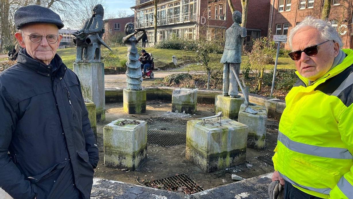 Für Frico Schmitz (l.) und Peter Petschik ist der Dichterbrunnen im Kreis Gütersloh mehr als ein Kunstwerk. Sie vermuten organisierte Diebesbanden hinter dem Raub | © Burkhard Hoeltzenbein
