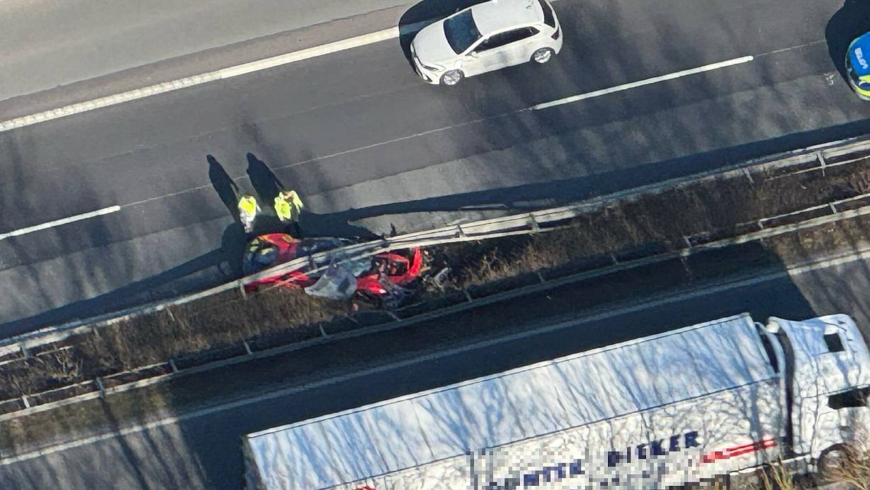 Luft-Perspektive: Der Ferrari verkeilte sich bei dem Unfall auf der A33 im Kreis Gütersloh in der Leitplanke. | © Paul Brinkmann