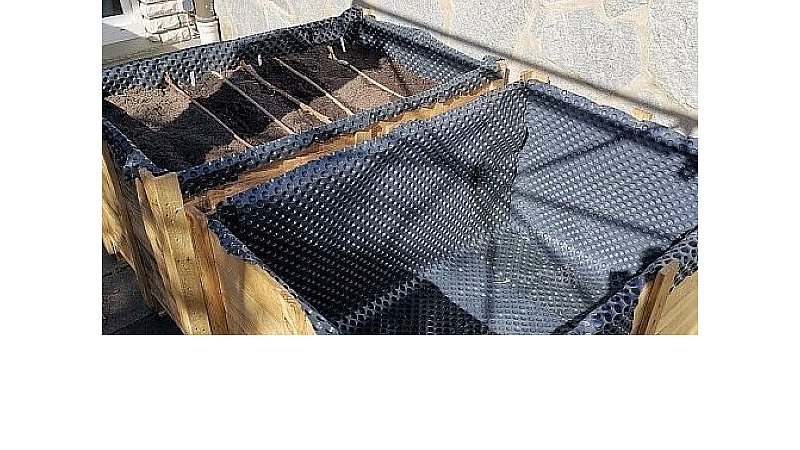 Steht das Hochbeet an seinem Platz, kann es an das Befüllen gehen. Besteht das Beet aus Holz, ist es wichtig, dass es mit Folie ausgekleidet wird, da Holz sonst schnell verrottet. Es gibt spezielle Noppenfolien, die das Holz nicht nur vor der Feuchtigkeit der Erde schützt, sondern auch das Kondenswasser abfließen lässt, das sich zwischen Folie und Holz bildet.