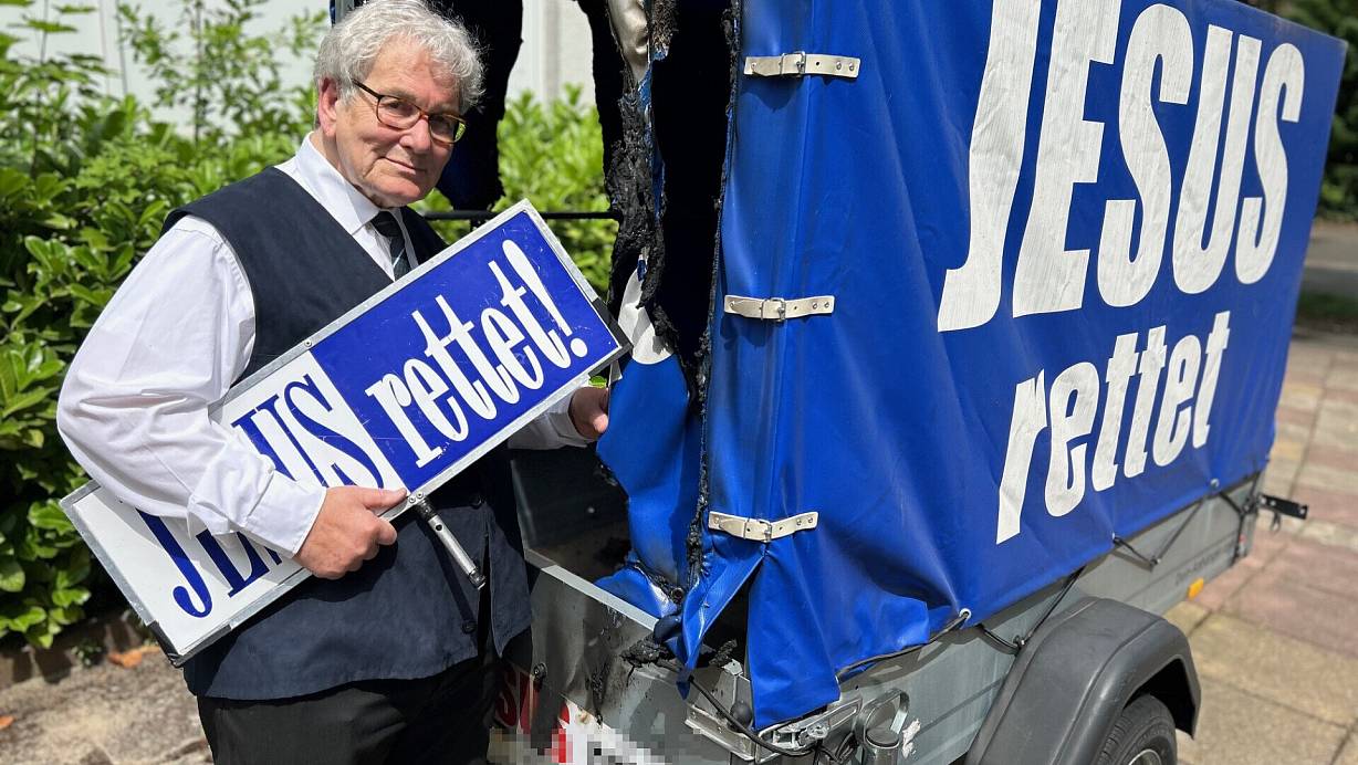 In Gütersloh brennt der Anhänger, mit dem Henning Heinrich Westrup seine christliche Botschaft verkündet. Es ist nicht die erste Attacke auf das besondere Gefährt. Jetzt ermittelt die Polizei.