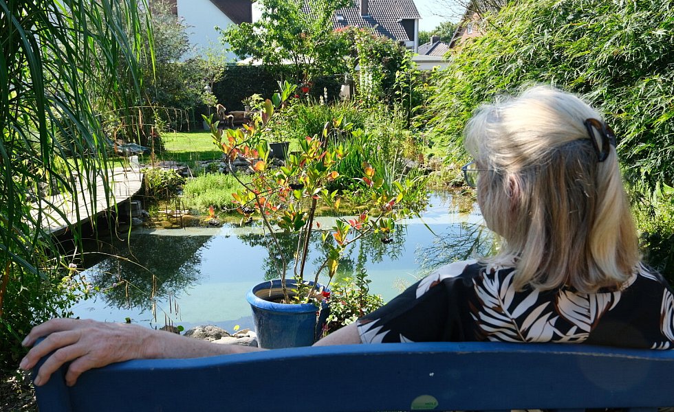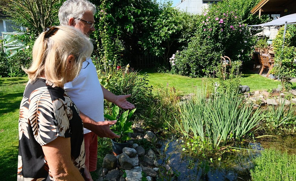 Bad Oeynhausen. Wasserpflanzen, ein prächtig blühender Rosenstrauch, zahllose Gräser und Blumen umrahmen den Teich im Garten von Lore und Dieter Halstenberg. Der ist nicht nur hübsch anzuschauen und sorgt für ein frisches Klima im Garten. Außerdem hat er noch eine weitere Funktion: Denn die eine Hälfte dient als Tauchbecken. „Wir haben einen Steg angelegt und so können wir nach dem Gang in unserer Gartensauna in den Teich hüpfen und abtauchen“, erzählt Dieter Halstenberg.