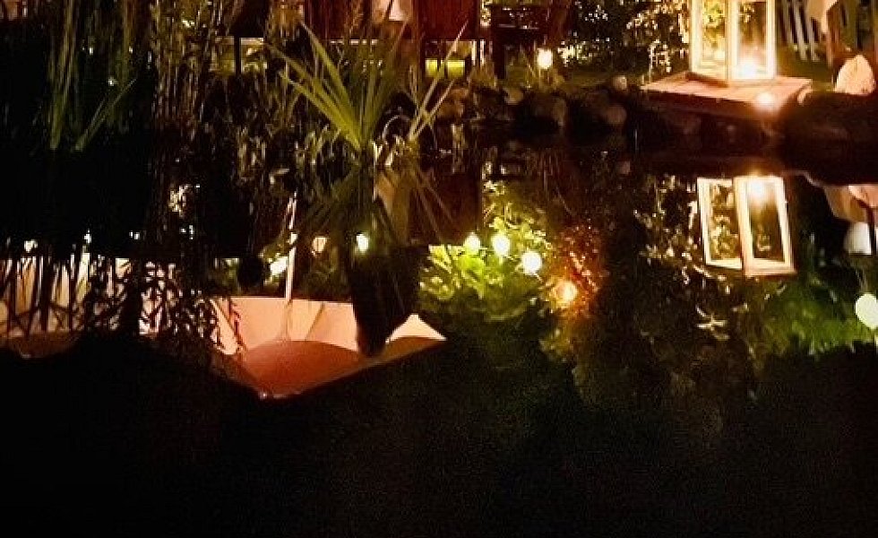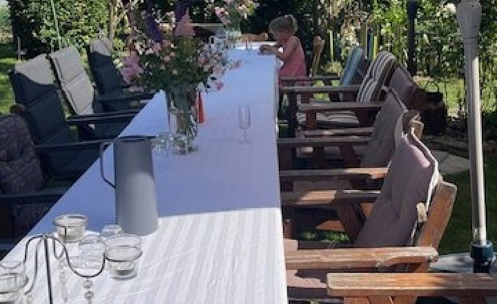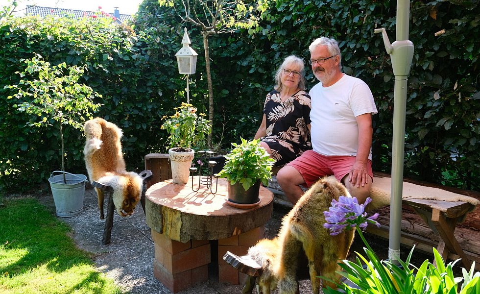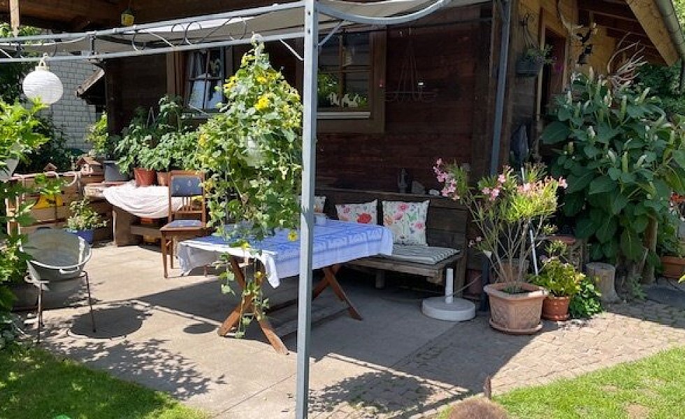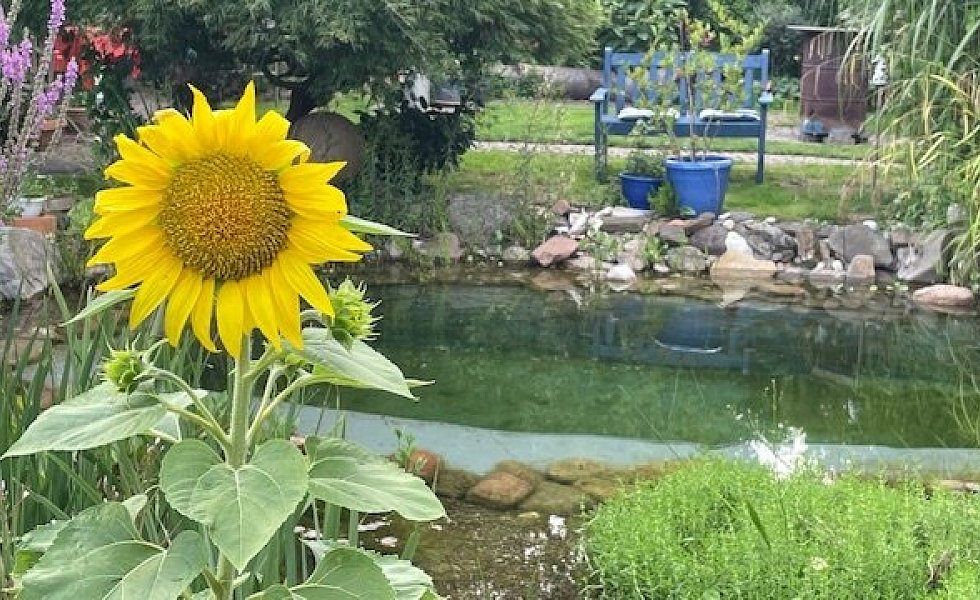 „Wir laden gerne Freunde in unseren Garten ein“, sagen Lore und Dieter Halstenberg unisono. Zur Feuerzangenbowle im Winter oder zum Brotbacken. Und vor allem zur Mittsommerparty im Juni. „Dann bauen wir eine große Tafel auf, alles wird mit Blumen und beleuchtet, geschmückt und wir feiern eine schöne Gartenparty.“ Bei sich die Gäste gerne auch mal auf den Steg setzen und ihre Füße im Tauchbecken baumeln lassen.
