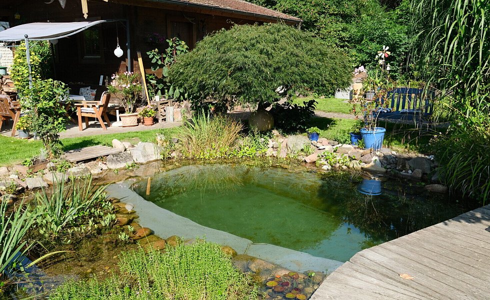 Fische hält das Ehepaar deshalb nicht im Teich und im Tauchbecken sind auch keine Pflanzen. Die gibt es nur in der zweiten Hälfte des Teichs, die mit Steinen aufgefüllt und bepflanzt ist. Für Bewegung und damit mehr Sauerstoff sorgt ein kleiner Strudel.