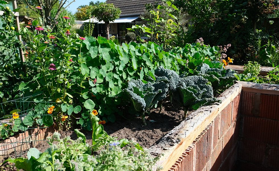 Den Gemüseanbau haben die Halstenbergs reduziert. „Im vergangenen Jahr haben uns die Schnecken so viel weggefressen“, ärgert sich Lore Halstenberg noch immer. Und ihr Mann ergänzt: „Und außerdem fällt uns das Bücken auch nicht mehr so leicht.“ Kurzum hat Dieter Halstenberg im vergangenen Herbst und Winter zwei große Hochbeete gemauert und dann mit Erde befüllt. Ganz bequem können die Beiden dort nun im Stehen werkeln und die Schnecken haben keine Chance an das Mauerwerk zu kommen.