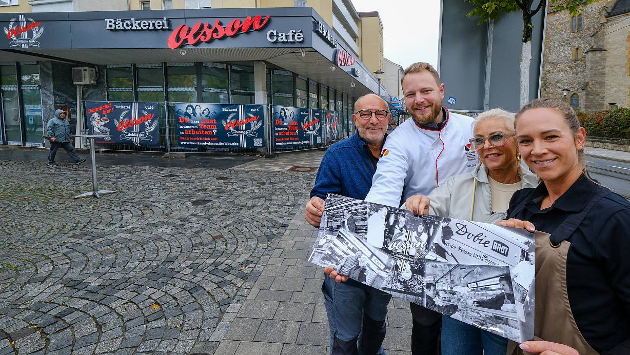 Erfolgreiche Familie: Jörg (v.l.), Nils, Gabriele und Melanie Olsson vor ihrer neuen Filiale in Bielefeld, die in Kürze öffnen soll. In den Händen halten sie eine Collage mit Motiven aus 68 Jahren Firmengeschichte. | © Andreas Zobe