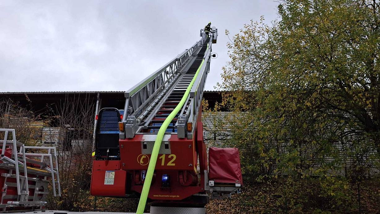 Zahlreiche Einsatzfahrzeuge von Feuerwehr, Polizei & Co. standen am Montagvormittag bei Lorenz-Kunststofftechnik im Industriezentrum in Spenge-Wallenbrück. Eine hölzerne Konstruktion brannte.