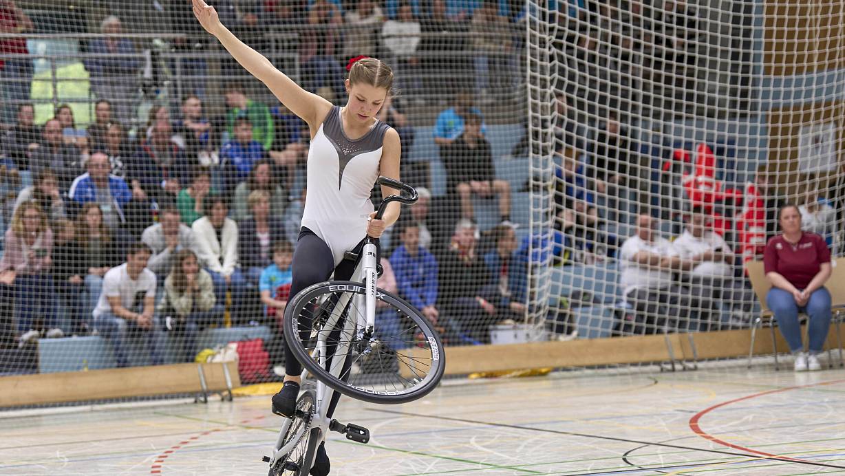 Seit mehr als zehn Jahren ist Antonia Blome eine feste Größe im Kunstradsport. Immer wieder probiert sie neue „Elemente“ aus, wie hier den Dornstandsteiger rückwärts. | © Familie Blome