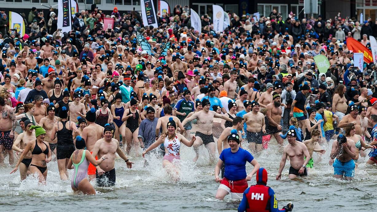 Eiskalter Start ins neue Jahr: Bei sehr windigem und kühlem Wetter haben am Mittwoch 694 Unerschrockene das Jahr 2025 mit einem Bad im Halterner Stausee begonnen. Die Teilnehmer liefen kurz nach 14.00 Uhr gemeinsam los und sprangen ins Wasser - offenbar trotz der Kälte bestens gelaunt, viele trugen dabei Pudelmützen oder Verkleidungen.