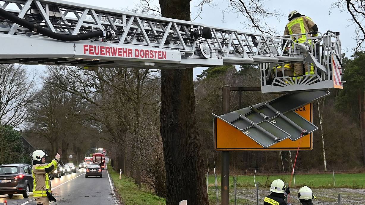 In Herdecke im südöstlichen Ruhrgebiet verletzte sich ein Mensch bei dem Versuch, Photovoltaik-Module auf einem Hausdach zu sichern. Auch in weiteren Städten im Ruhrgebiet meldeten die Feuerwehren zahlreiche Einsätze. Bäume stürzten um und Dachziegel lösten sich. 87 Einsatzstellen gab es demnach am Nachmittag alleine in Bochum, 40 in Recklinghausen. In Werne knickte ein Telefonmast um und musste von der Feuerwehr gesichert werden.