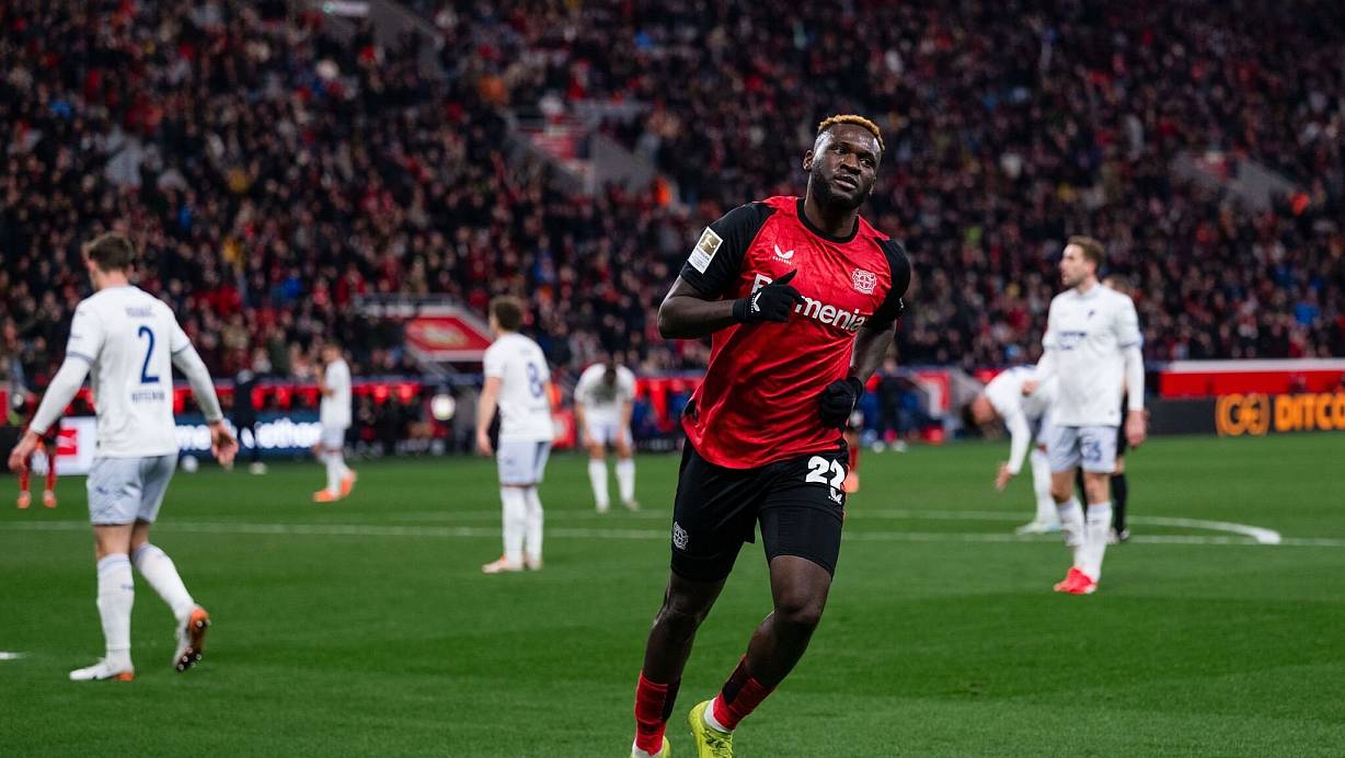 Boniface-Traumcomeback und ein Bundesliga-Novum: Der deutsche Meister Bayer Leverkusen hat Platz zwei hinter den Bayern mit einem ungefährdeten Sieg gegen 1899 Hoffenheim gefestigt. Beim 3:1 (2:0) am Sonntagabend traf auch Victor Boniface (15. Minute) wenige Tage nach seinem geplatzten Transfer zu Cristiano Ronaldos saudi-arabischen Club Al Nassr. Außerdem waren Jeremie Frimpong (19.) und Patrik Schick (51.) für die Werkself erfolgreich. Leverkusens Alejandro Grimaldo sah nach wiederholtem Foulspiel Gelb-Rot (61.). Für die abstiegsbedrohten Kraichgauer traf Gift Orban (64.).