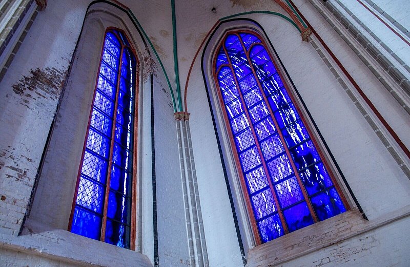 Nach dem Mauerfall kehrte Uecker regelmäßig zum Arbeiten nach Mecklenburg zurück. Für den Schweriner Dom gestaltete er vier große, in Blautönen gehaltene Glasfenster, die Ende 2024 in seinem Beisein feierlich eingeweiht wurden. Für ihn ein emotional sehr bewegender Moment, wie er im Interview mit der «Rheinischen Post» bekannte: «Meine Tränen flossen, meine Gefühle übermannten mich bei der Einweihung der Fenster.» Das Fenster-Ensemble bezeichnete der Künstler als «Lichtbogen».