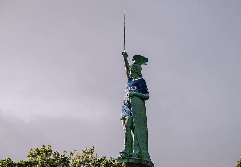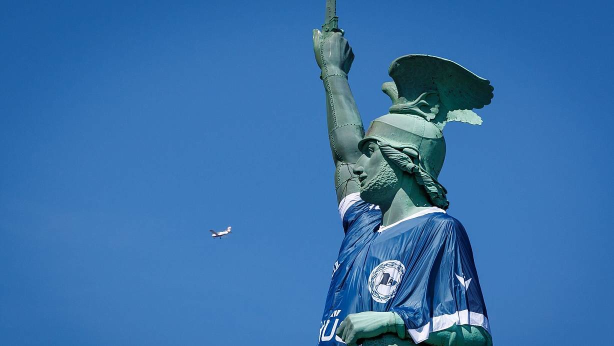 Das etwa 130 Quadratmeter große Trikot hatte das Denkmal im Teutoburger Wald Mitte Mai dreizehn Tage anlässlich des ersten DFB-Pokalfinaleinzugs der Vereinsgeschichte in den Farben des DSC geschmückt. Die spektakuläre Aktion lockte zahlreiche Besucherinnen und Besucher an und sorgte auch über die Region hinaus für Aufmerksamkeit.