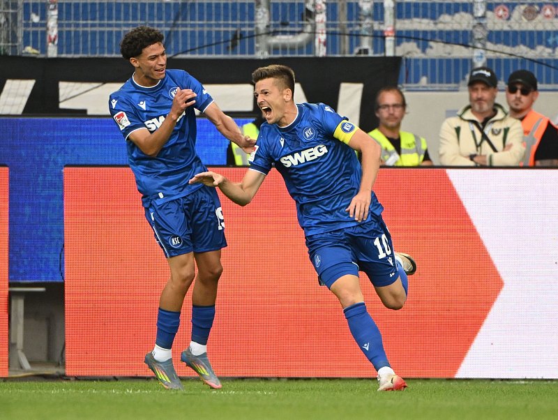 Nach den frühen Toren von Youngster Louey Ben Farhat (7.) und Kapitän und Jubilar Marvin Wanitzek (21.) führten die Badener schnell mit 2:0. Die Gäste, die in der vergangenen Saison knapp den Abstieg vermieden, taten sich anfangs schwer. Eine feine Einzelaktion von Etienne Amenyido (32.) brachte sie aber zurück ins Spiel.
