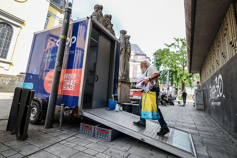 Ein Modellprojekt zur sofortigen Linderung der Not bietet das im vergangenen Herbst gestartete Angebot «Jot drop» in Düsseldorf. Obdach- und Wohnungslose können mitten in der Altstadt nahe der Kabarett-Bühne «Kommödchen» duschen - im Winter warm, jetzt erfrischend kühl. Sie haben hinter der geschlossenen Tür des Duschmobils eine Viertelstunde nur für sich und ihr Wohlbefinden. «Hier können sie sich erfrischen und Ruhe tanken», sagt Projektleiter Lars Kollender.
