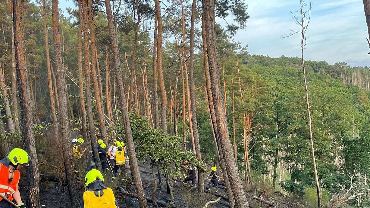 Am Dienstagnachmittag hatten Tausende Quadratmeter Wald an einem steilen Hang gebrannt. Die Feuerwehr sprach von einer Fläche von bis zu 6.000 Quadratmetern. Weil die Stelle für Fahrzeuge nicht erreichbar sei, habe ein Polizeihubschrauber Löschwasser aus der Luft abgeworfen. Fast 150 Einsatzkräfte waren laut Feuerwehr im Einsatz.