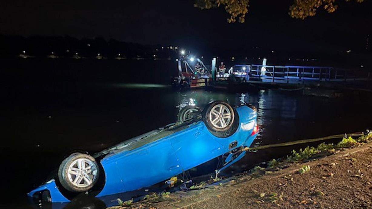 Ein Auto rollt in den Baldeneysee in Essen. Die Insassen konnten sich retten. | © -/Feuerwehr Essen/dpa