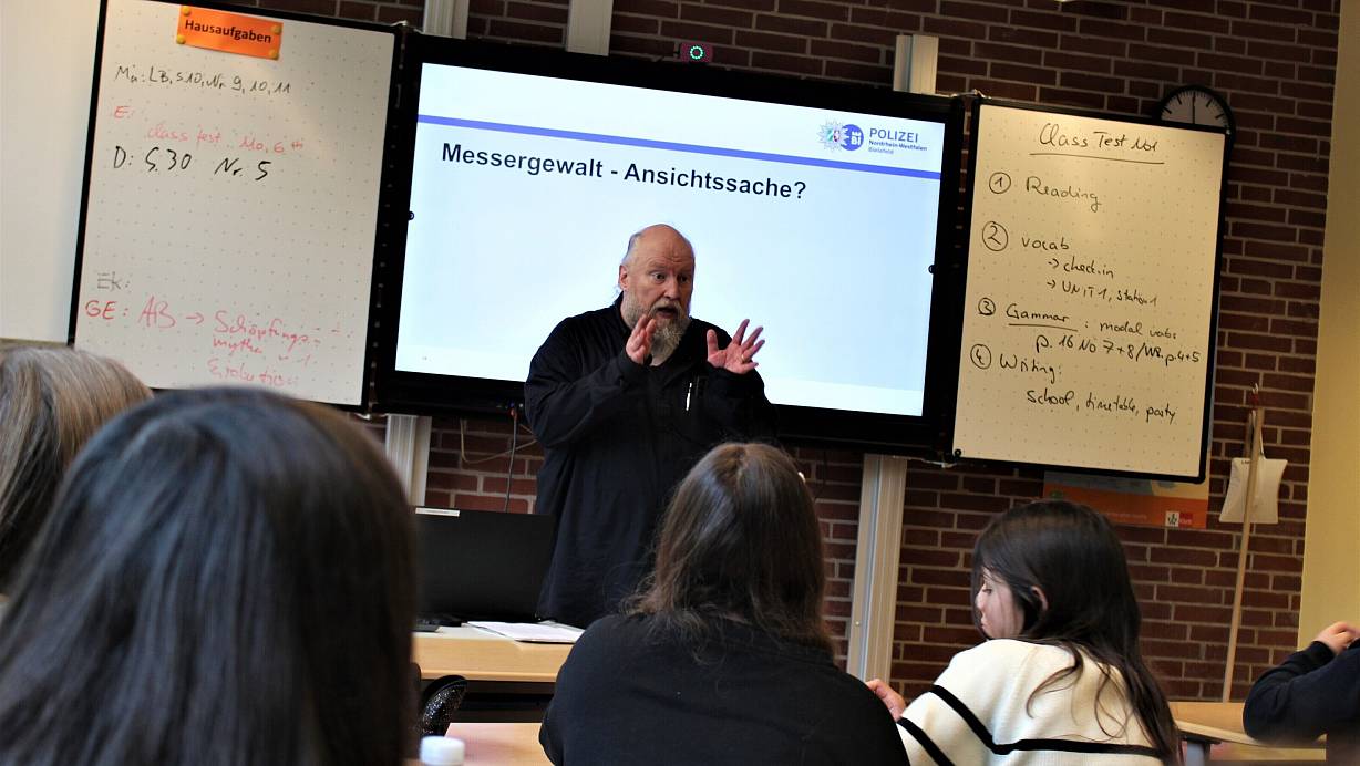 Messerprävention zwischen Hausaufgaben und Text-Abläufen: Die Schüler des Hans-Ehrenberg-Gymnasiums in Bielefeld-Senne lauschen Kriminalhauptkommissar Kai Rosin. | © Lukas Brekenkamp