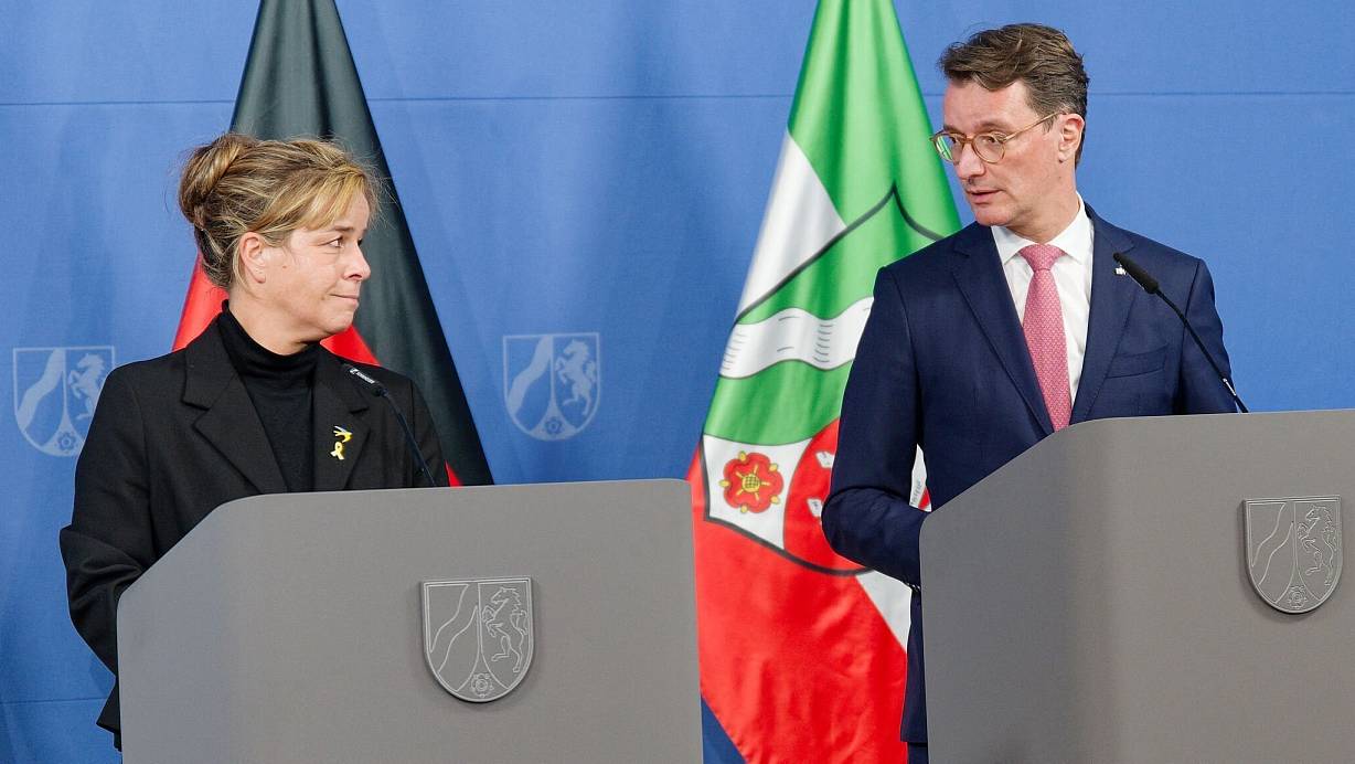 Mona Neubaur (Grüne), Wirtschaftsministerin von Nordrhein-Westfalen, und Hendrik Wüst, Ministerpräsident von Nordrhein-Westfalen (CDU), stehen bei der Pressekonferenz zum Investitionsprogramm des Landes auf dem Podium. | © Henning Kaiser/dpa