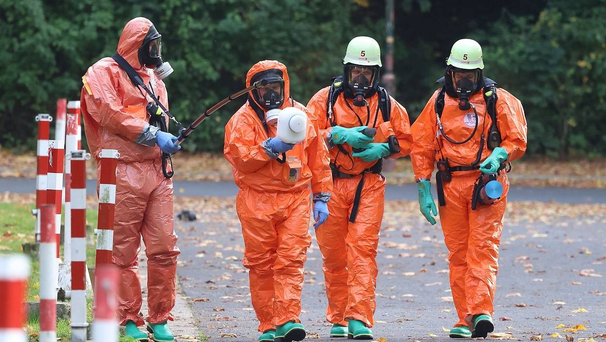 Ein Auto wurde von einem weißen Zelt abgedeckt. In dem Fahrzeug saßen nach Angaben der Feuerwehr zwei zivile Polizeibeamte und eine weitere dritte Person. Keiner der Personen sei kontaminiert gewesen, sagte der Feuerwehrsprecher. Das Fahrzeug fuhr später mit den Insassen ab. Um wen es sich bei der dritten Person handelte, war zunächst unklar.