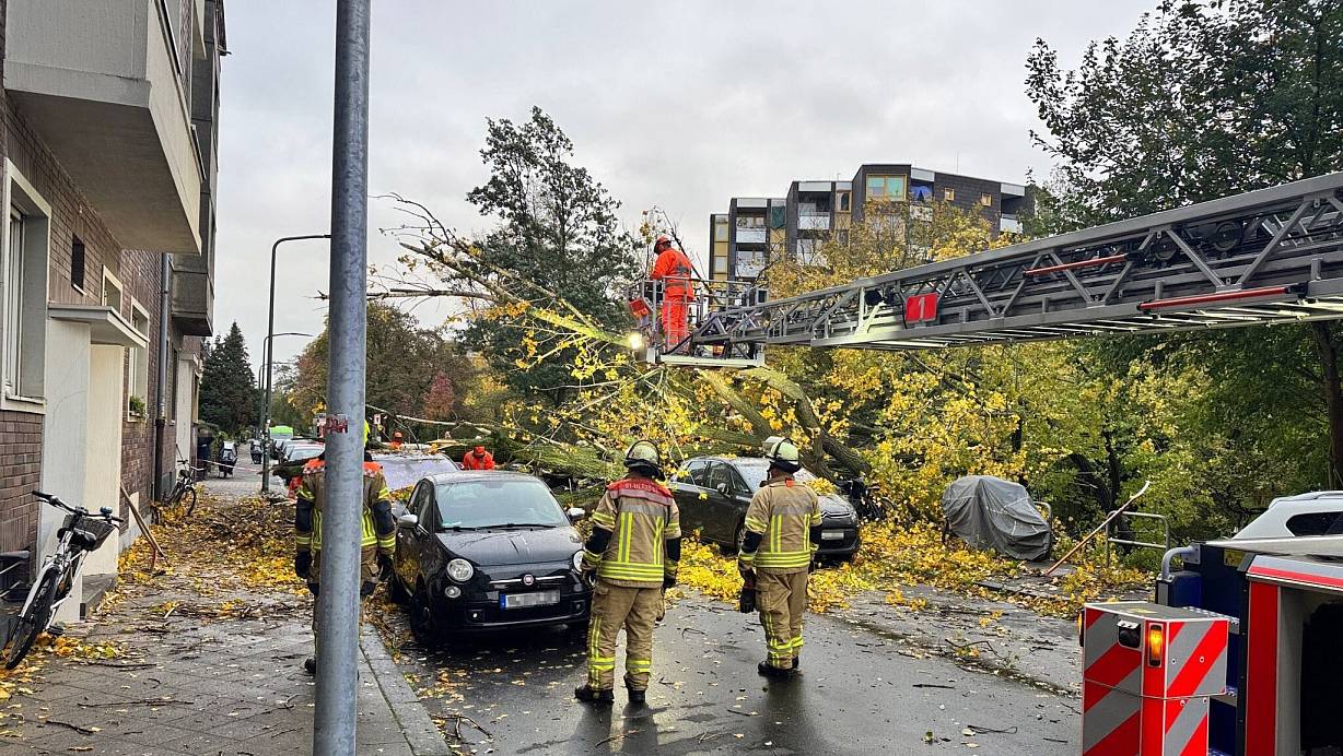 Wie die Polizei mitteilte, stürzte in Düsseldorf ein rund 50 Meter hoher Baum auf mehrere geparkte Autos und beschädigte dabei ein Wohnhaus. Auch der Aquazoo in der Landeshauptstadt wurde vom Sturm getroffen. Die Tropenhalle des Zoos bleibe wegen eines Schadens am Dach bis auf weiteres für Besucher geschlossen, teilte die Stadt mit. Die in der Halle lebenden Tiere, darunter Krokodile und Schildkröten, seien nicht verletzt worden.