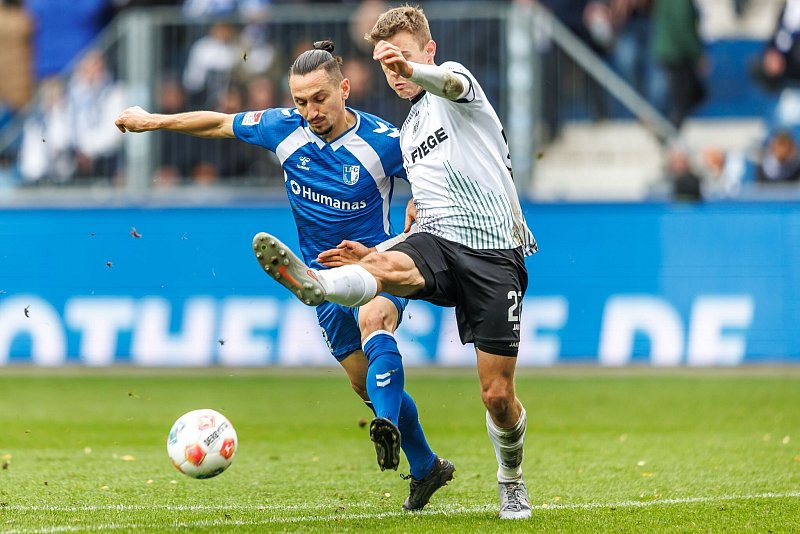 Baris Atik (l, 1. FC Magdeburg) kämpft gegen Jano ter Horst (Preußen Münster) um den Ball. - © Andreas Gora/dpa