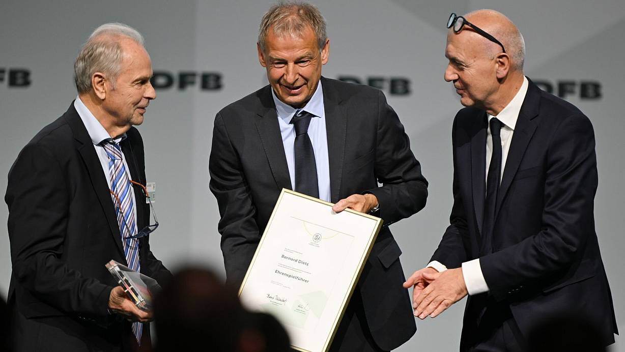 Bernard Dietz, Silvia Neid und posthum Doris Fitschen sind zu Ehrenspielführern der deutschen Fußball-Nationalteams ernannt worden. «Die Ehrung für dich heute ist längst, längst überfällig», sagte Laudator und Ex-Weltmeister Jürgen Klinsmann beim DFB-Bundestag in Frankfurt/Main über den langjährigen Duisburger Dietz. Der Europameister von 1980 kämpfte bei der Ehrung mit den Tränen.